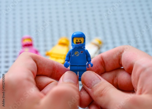 © rosinka79, Obraz premium Tambov, Russian Federation - June 11, 2025 Person hands holding a blue Lego astronaut minifigure against a gray baseplate background