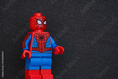 © rosinka79, Naklejka premium Tambov, Russian Federation - March 18, 2025 Lego Spider-Man minifigure against a black background