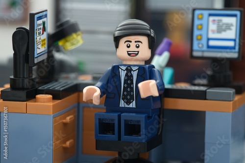 © Stepan Popov, Obraz premium Tambov, Russian Federation - May 26, 2025 A happy Lego businessman minifigure sitting on a chair behind a computer in an office and looking at the camera. Close up.