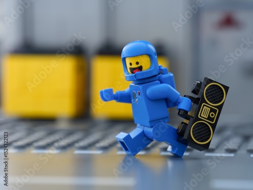 © rosinka79, Obraz premium Tambov, Russian Federation - May 30, 2025 Blue Lego astronaut minifigure running with boombox.