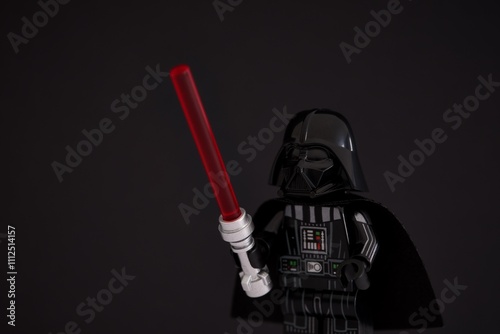 © rosinka79, Naklejka premium Tambov, Russian Federation - November 14, 2024 Portrait of Lego Darth Vader minifigure with lightsaber against black background