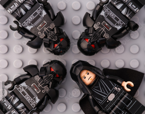 © rosinka79, Naklejka premium Tambov, Russian Federation - October 01, 2023 Four Lego Star Wars character minifigures - Luke Skywalker and 3 Dark Troopers, on a gray baseplate background.