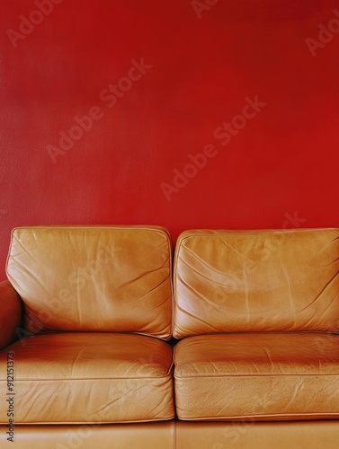 © Alexandr, Obraz premium Tan Leather Couch Against Red Wall