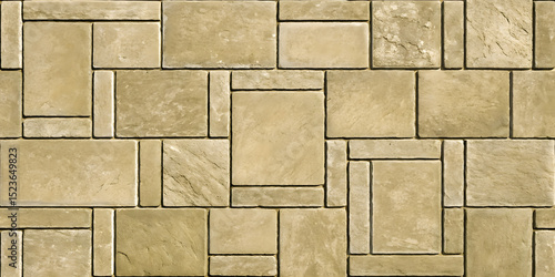 Naklejka premium Tan limestone rectangular tiles arranged in modular pattern with varied sizes...
