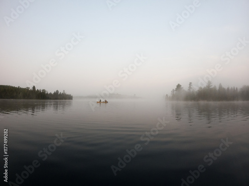 Fototapeta premium Tandem canoe paddling in a misty morning on the lake in the Boundary Waters...