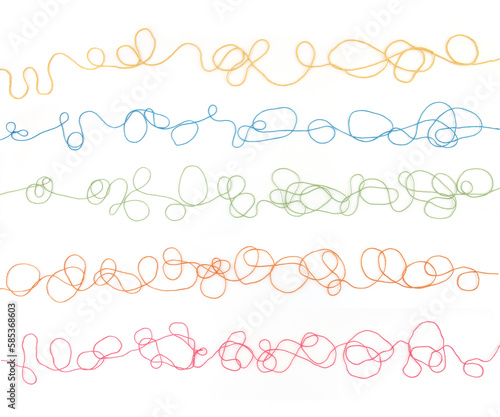 Obraz premium Tangled colorful cotton threads isolated on white background. Abstract thread lines pattern.