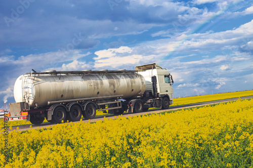 Naklejka premium tank goes on the road. truck rides near the field. rainbow in the blue sky