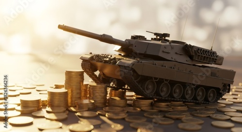 © Margarita Ratatosk, Obraz premium Tank model on a pile of gold coins. Concept of economic war, sanctions, and financial crisis. Illustration of military spending impact on economy.