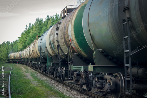 Naklejka premium Tank wagons with oil. Freight train in forest