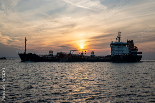 © Gatis, Fototapeta premium Tanker at sunset, ship silhouette
