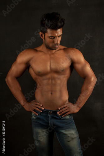 © Haider Azim, Fototapeta premium Tanned trainer body builder posing chest athletic body