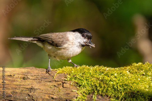 Naklejka premium Tannenmeise sitzt auf einem alten Ast mit Moos bewachsen