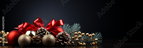 Fototapeta premium Tannenzweige und goldene Weihnachtskugeln als Dekoration zu Weihnachten Nahaufnahme als Banner im Querformat, ai generativ