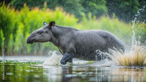 Fototapeta premium Tapir splashing in the water during a heavy rainstorm , tapir, animal, wildlife, running, water, rain, storm, nature, outdoors