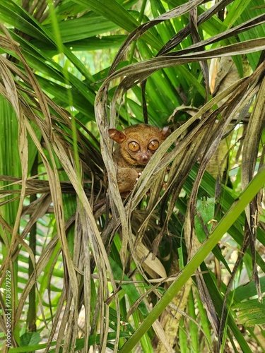 © S, Obraz premium Tarsier Hanging in the Tree – Front View