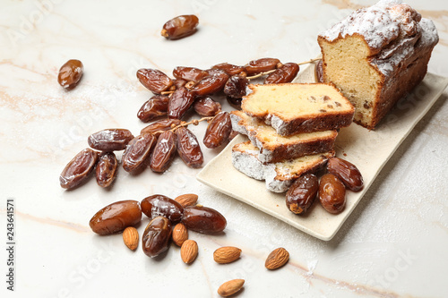 Obraz premium Tasty cake with dates on table