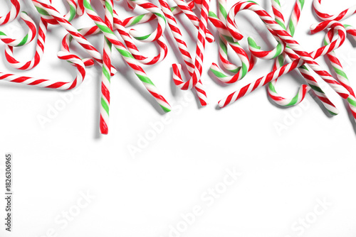 © New Africa, Fototapeta premium Tasty candy canes on light background, flat lay with space for text. Christmas treat