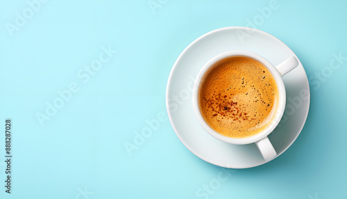 © Oleksiy, Fototapeta premium Tasty coffee in cup on light blue background, top view