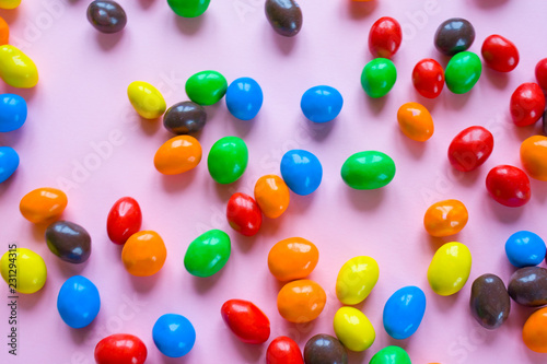 Obraz premium Tasty colorful candies on pink background. Flat lay