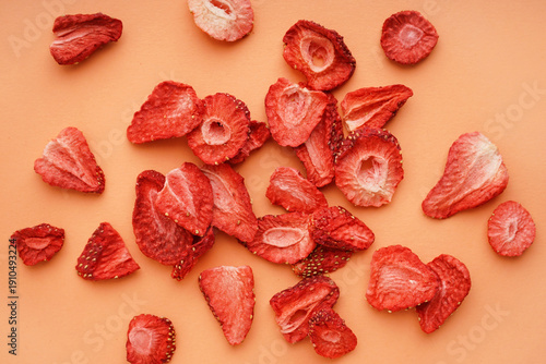 Naklejka premium Tasty freeze-dried strawberries on orange background
