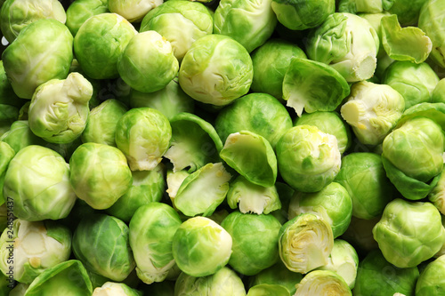 Fototapeta premium Tasty fresh Brussels sprouts as background, top view
