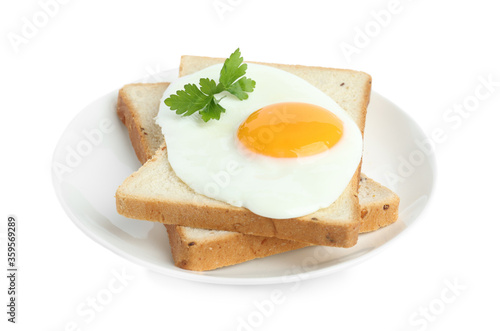 Fototapeta premium Tasty fried chicken egg with bread and parsley isolated on white