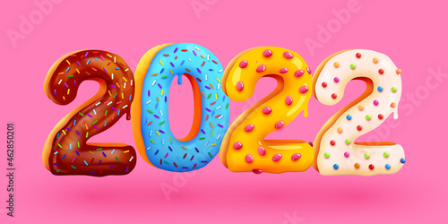 © hobbitfoot, Fototapeta premium Tasty Greeting Card Happy New Year 2022. Colorful glazed Sweet numbers. Greeting Card, Banner, Poster.