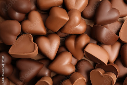 Fototapeta premium Tasty heart shaped chocolate candies as background, top view. Valentine's day...