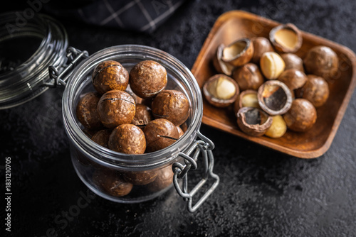 Fototapeta premium Tasty macadamia nuts in jar on black table.