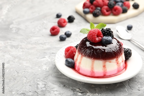 © New Africa, Naklejka premium Tasty panna cotta with berries and jam on light grey table, closeup. Space for text