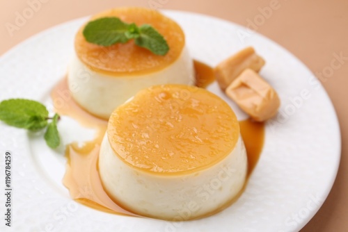 Fototapeta premium Tasty puddings with caramel sauce served on light brown background, closeup