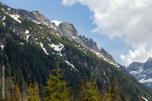 Fototapeta premium Tatra Mountains in Poland showcasing rugged peaks, snow-capped summits, and...