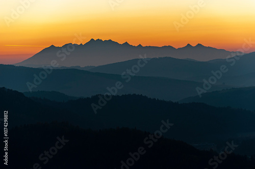 Fototapeta premium Tatry widok z Malnika muszyna, Zachód słońca