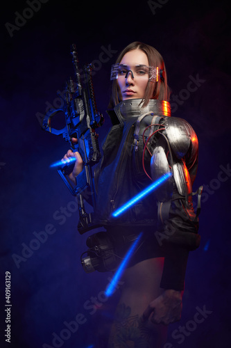 Naklejka premium Tattoed martial woman in cyberpunk style dressed in stylish black clothing. Fashionable and sexy female soldier holding a futuristic rifle and posing in dark background with blue lights.