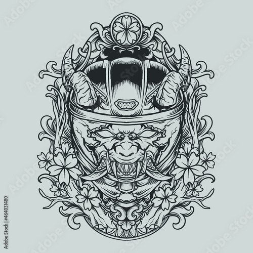 Fototapeta premium tattoo and t shirt design black and white hand drawn devil with helm full mask engraving ornament