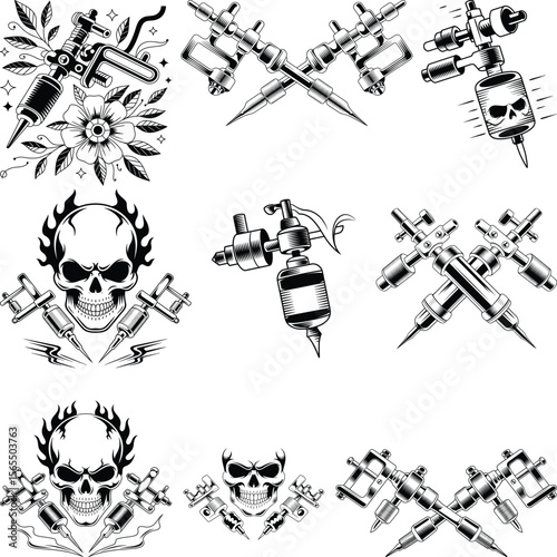 © @ripongrafix471, Fototapeta premium Tattoo Machine Svg Bundle, Tattoo Stencil, Floral Tattoo Machine Svg