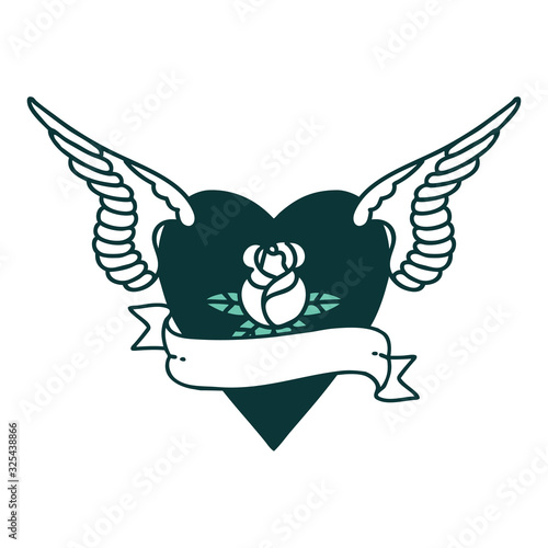 Fototapeta premium tattoo style icon of a heart with wings a rose and banner