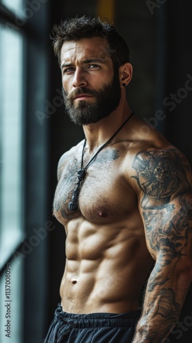 Fototapeta premium Tattooed Fitness Male in Urban Setting