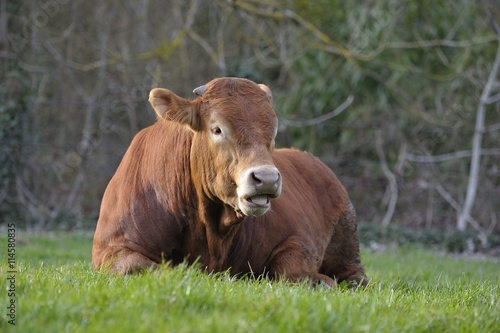 © rbonin, Fototapeta premium taureau de race limousine qui rumine, couché dans le pré