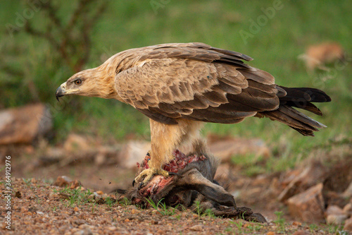 Fototapeta premium Tawny eagle stands on carrion bending head
