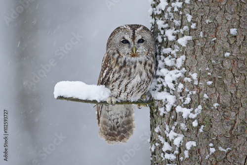 Fototapeta premium Tawny Owl snow covered in snowfall during winter, tree trunk with snow