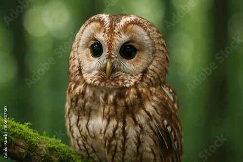 © Sergey, Fototapeta premium Tawny owl with deep black eyes sits on green mossy branch, captured in natural style, set against a blurred forest background, symbolizing wildlife