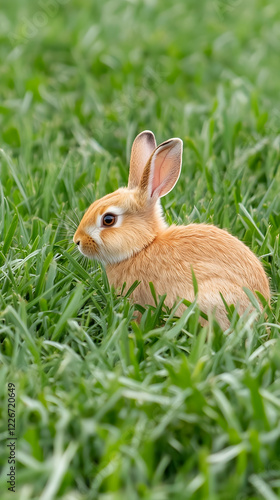 © Pic, Fototapeta premium Tawny rabbit in grassy field; peaceful outdoor scene