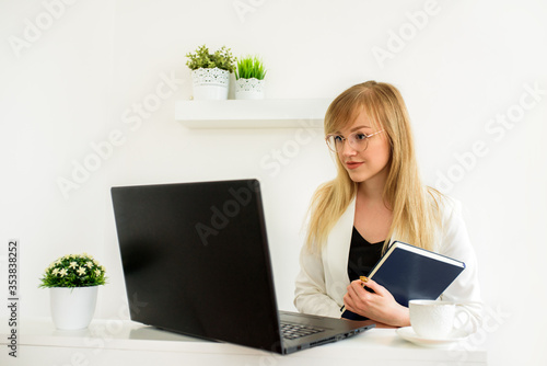 Fototapeta premium Tax advice to lawyer or accountant.Female lawyer giving a consultation online at home. Young girl student at a laptop. Online counseling, online education, distance learning.