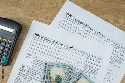 © Tania, Obraz premium Tax form 1040 on wooden office desk, financial document.