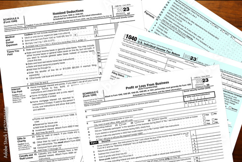 © Stone's Throwe Photo, Obraz premium 2023 tax forms on a desk.