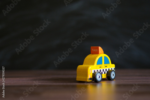 © Svetlana, Obraz premium Taxi operator concept. Price of services. Yellow car toy taxi on black background space for text