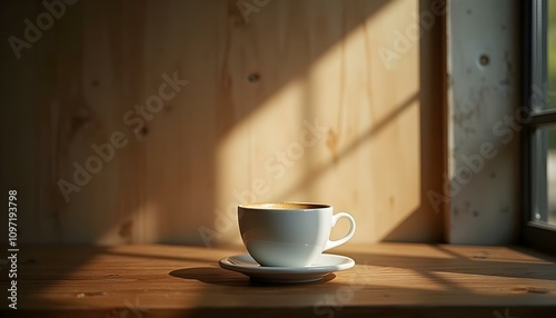 © SirArbusto, Fototapeta premium Taza de café en una cafetería minimalista, ambiente moderno y tranquilo