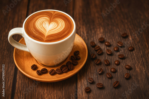 © fantasyart3d, Obraz premium Tazza di cappuccino con disegno a cuore nella schiuma e chicchi di caffè su tavolo di legno. Generative AI