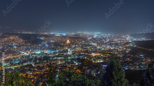 Obraz premium Tbilisi cityscape, Georgia day to night aerial timelapse. Top view over the...